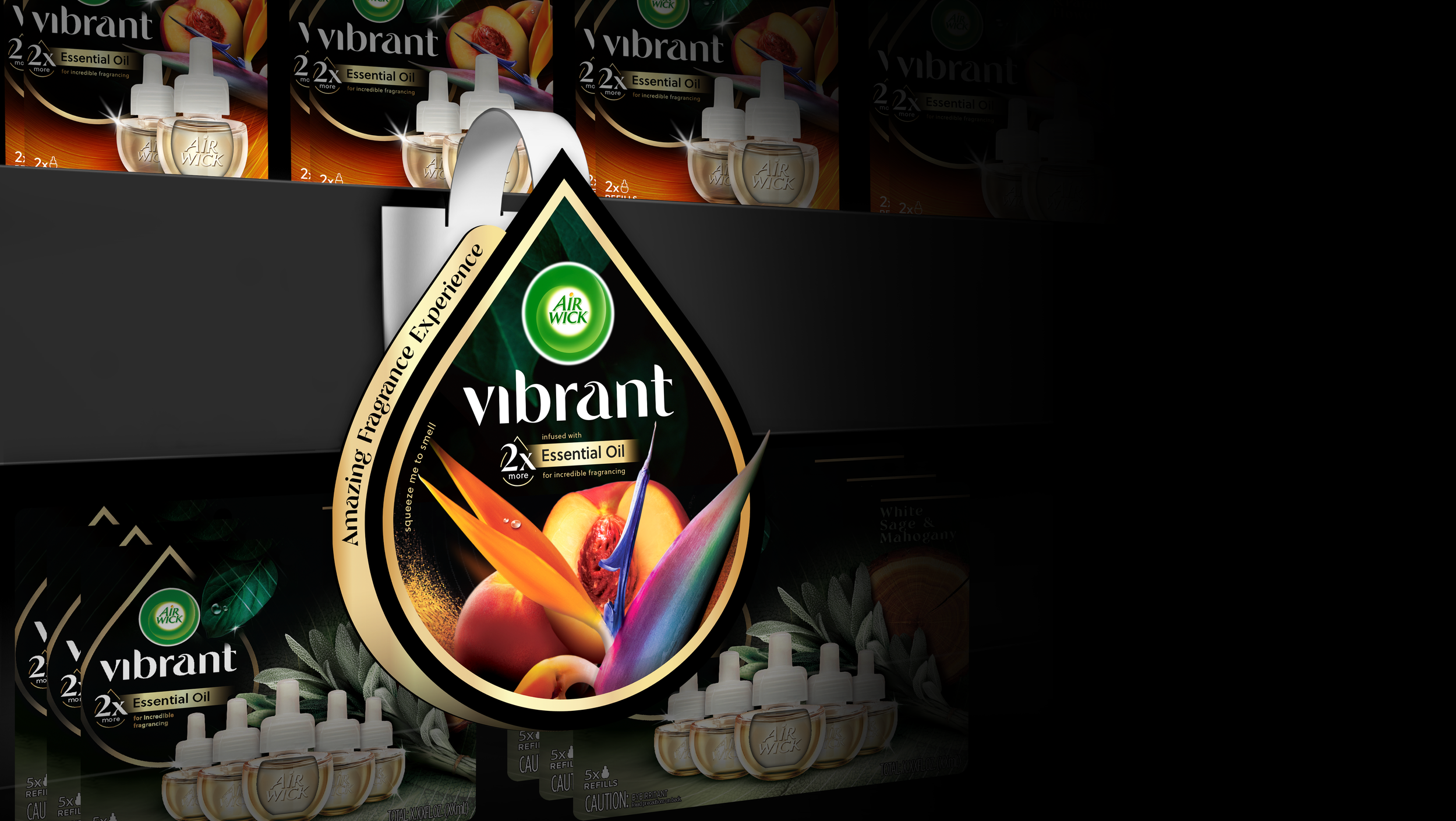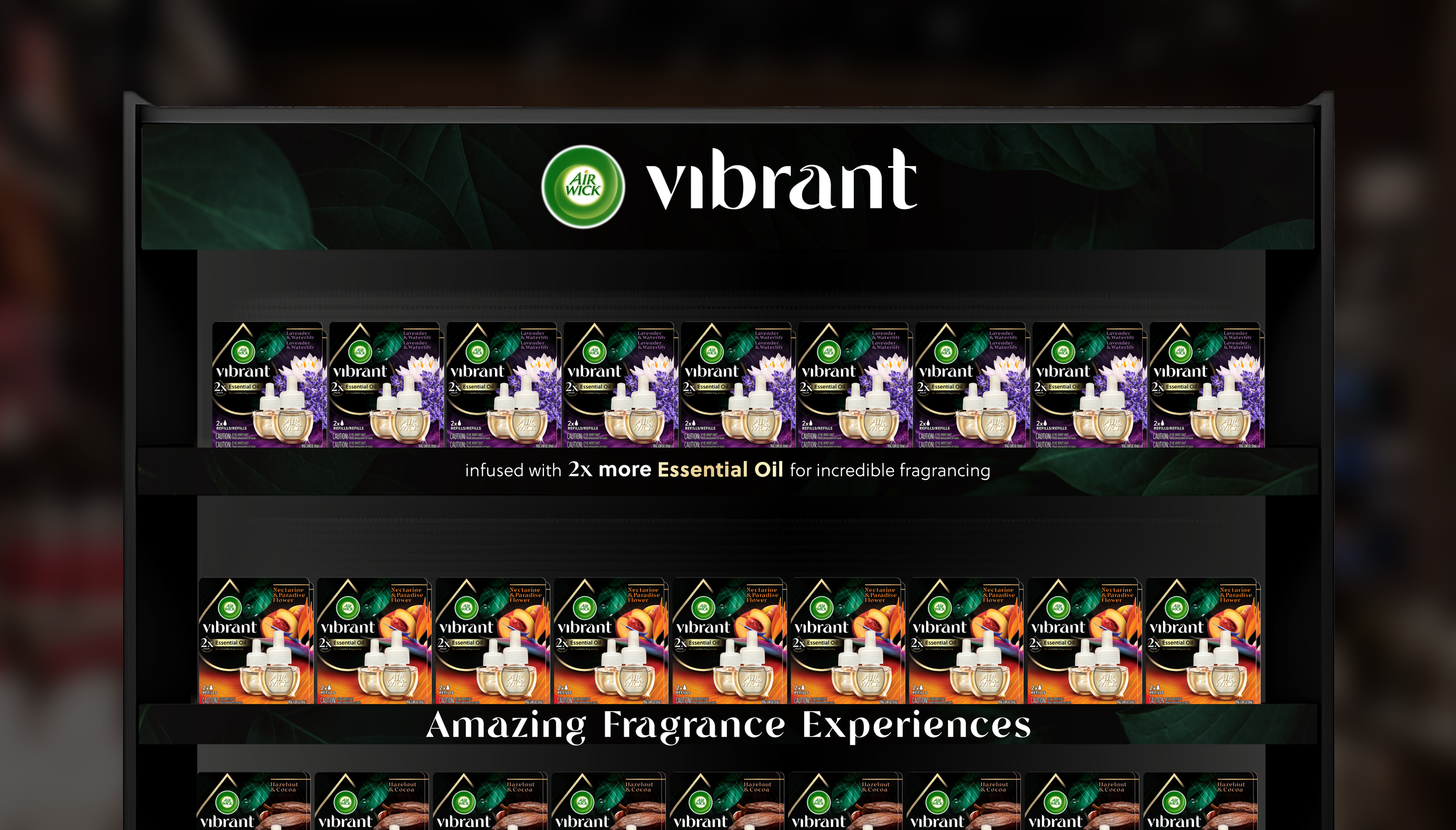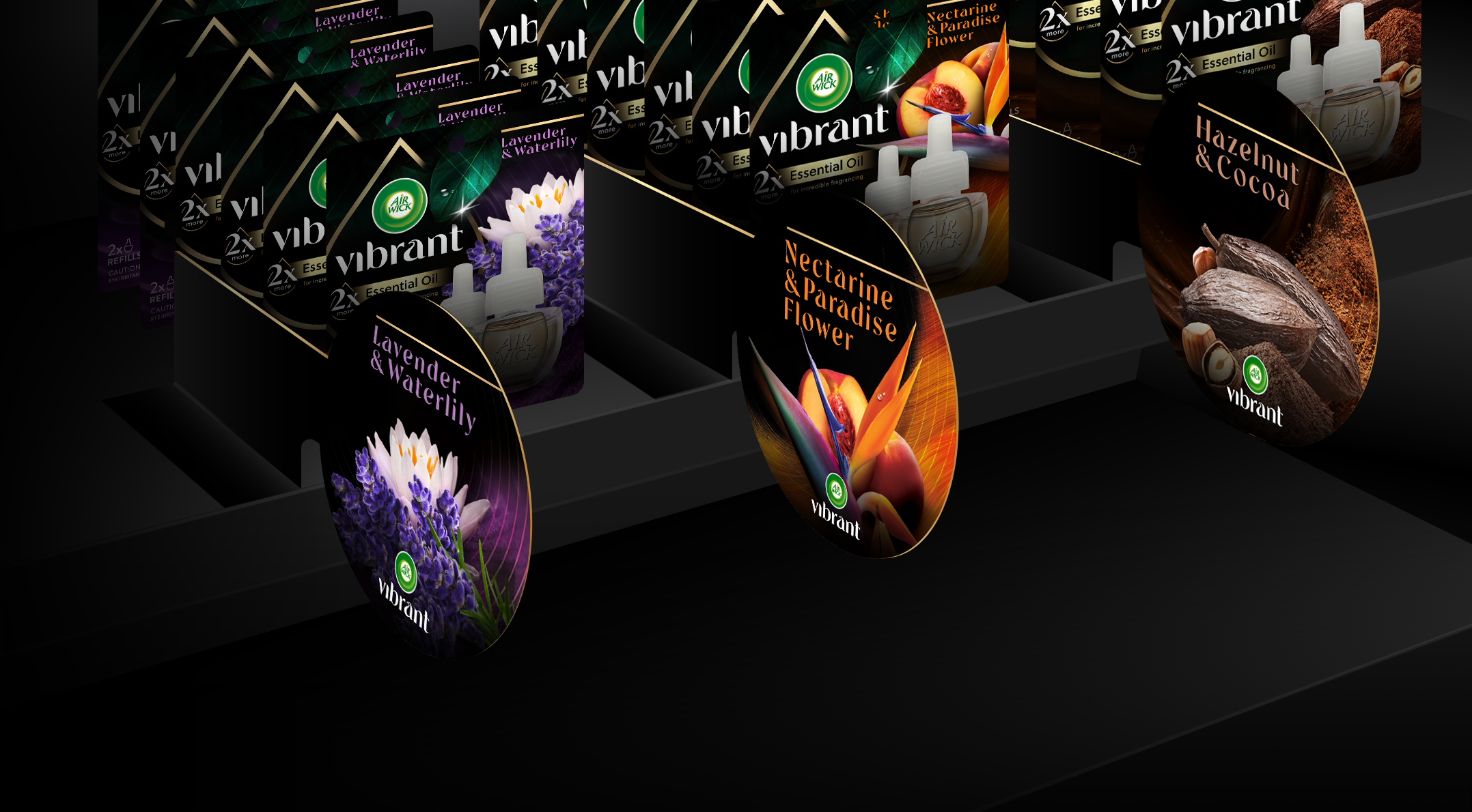 Bold black backgrounds paired with vivid, close-up photography and rich, tactile textures communicate a sense of nature that is both pure and powerful. This visual approach establishes a distinctive identity that clearly sets Vibrant apart from the existing Air Wick ranges and stands out confidently on shelf. It also spotlights the new device, reinforcing its elevated, premium positioning above Air Wick’s core offering. The brand’s familiar logo remains, but it is now complemented by a bespoke wordmark that reflects nature’s soft forms.