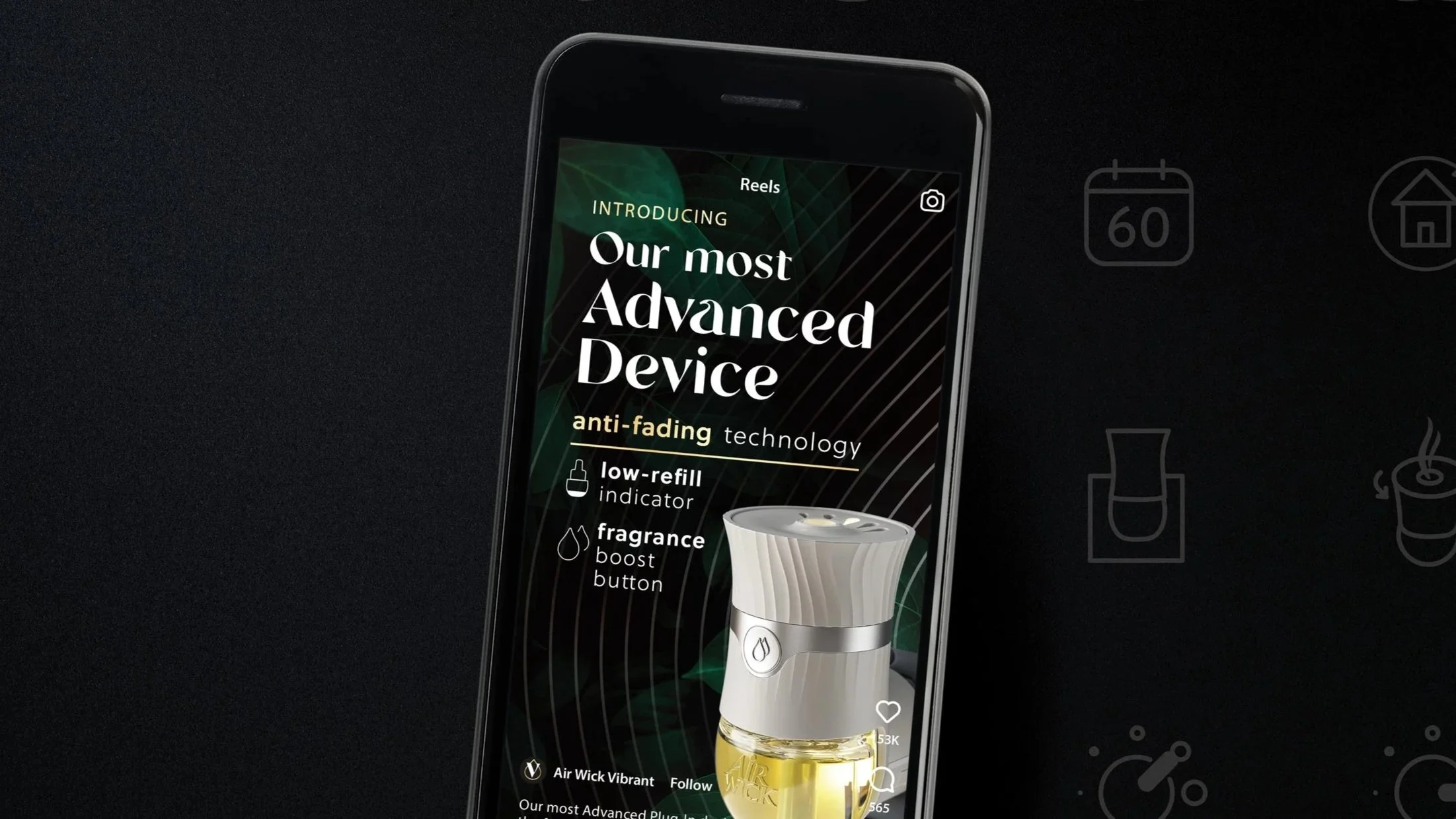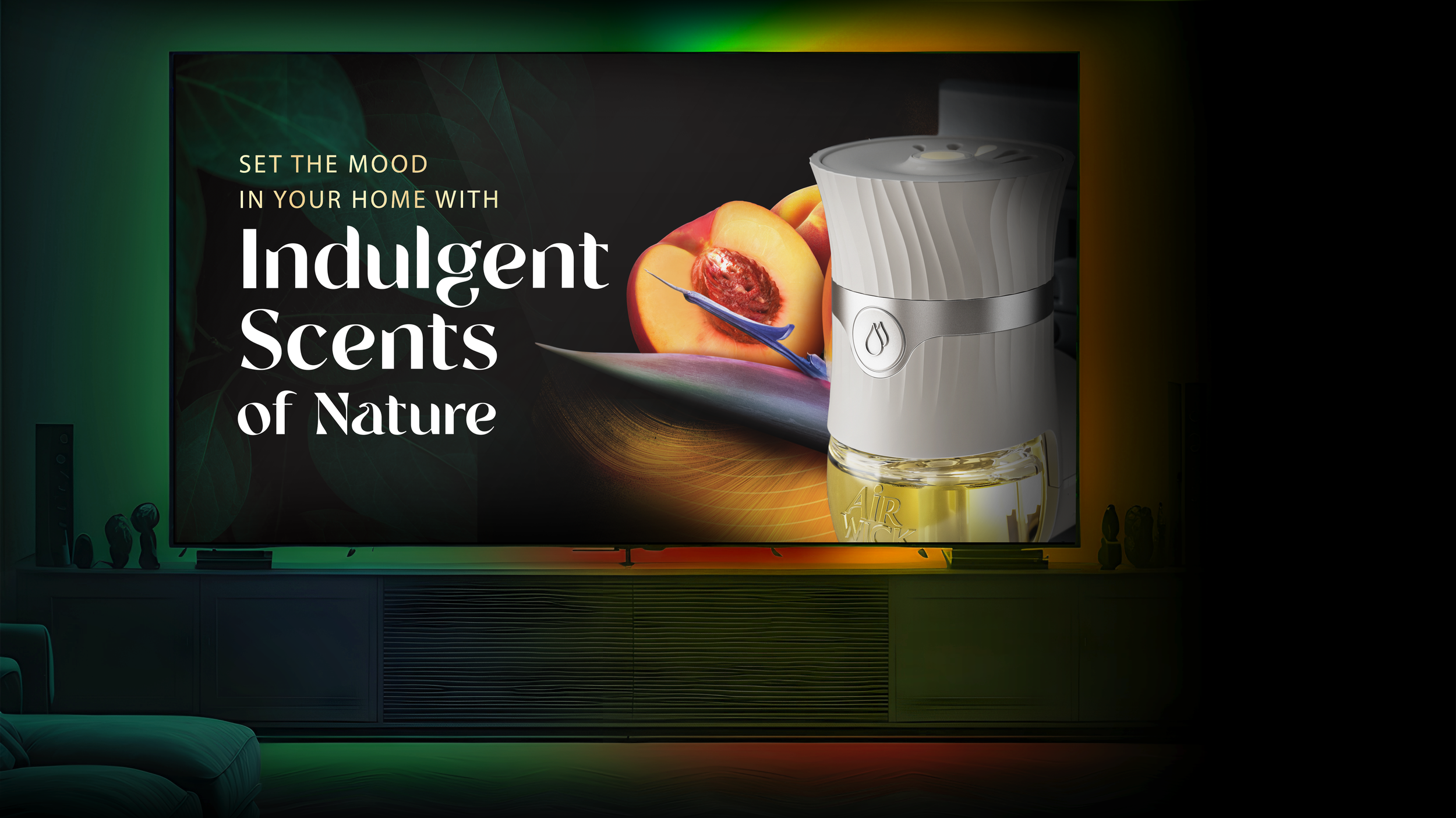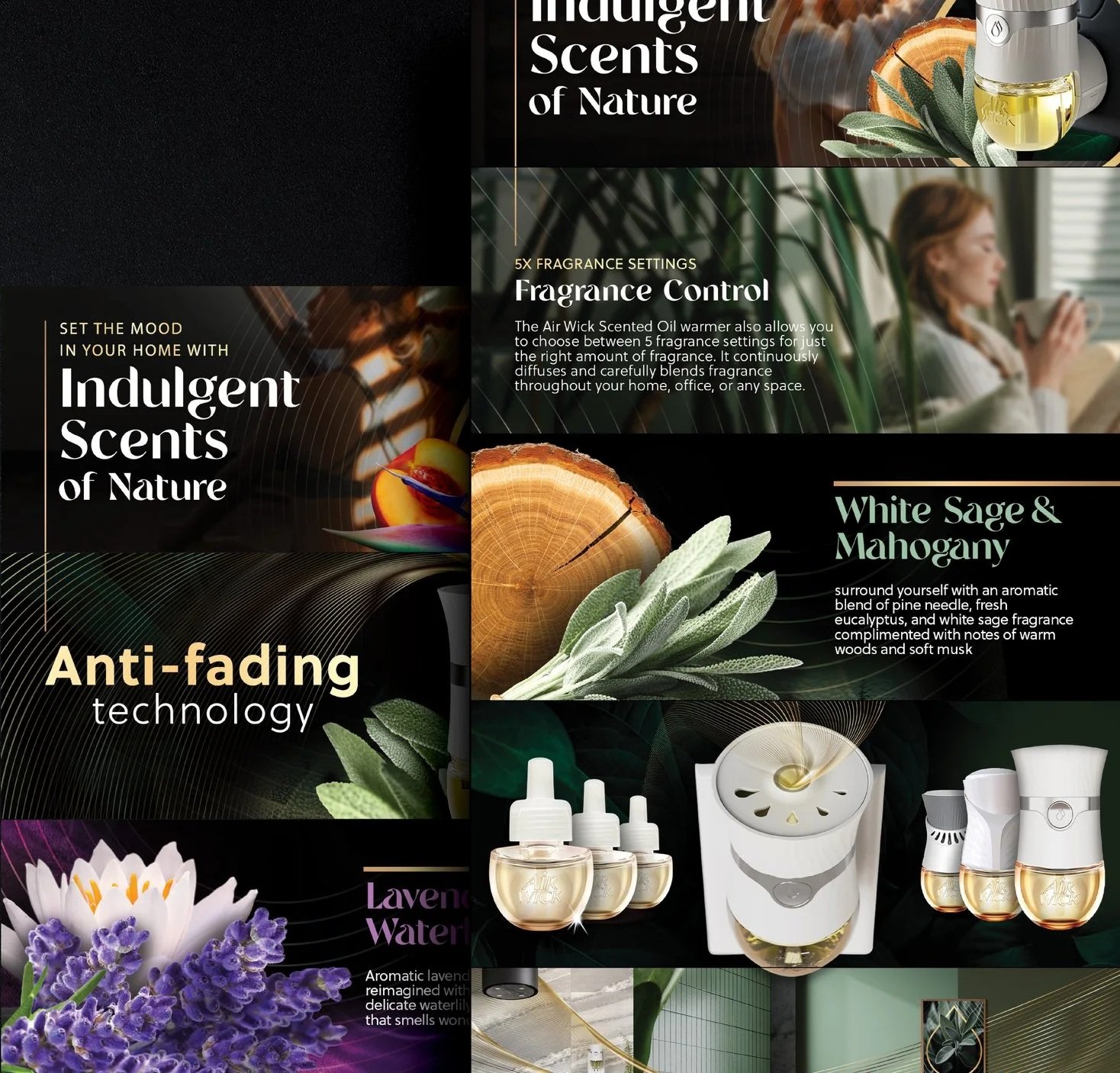 Bold black backgrounds paired with vivid, close-up photography and rich, tactile textures communicate a sense of nature that is both pure and powerful. This visual approach establishes a distinctive identity that clearly sets Vibrant apart from the existing Air Wick ranges and stands out confidently on shelf. It also spotlights the new device, reinforcing its elevated, premium positioning above Air Wick’s core offering. The brand’s familiar logo remains, but it is now complemented by a bespoke wordmark that reflects nature’s soft forms.